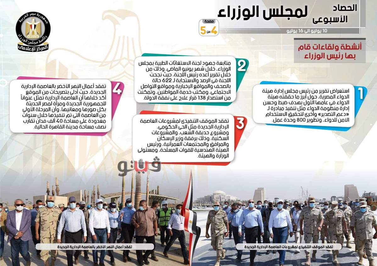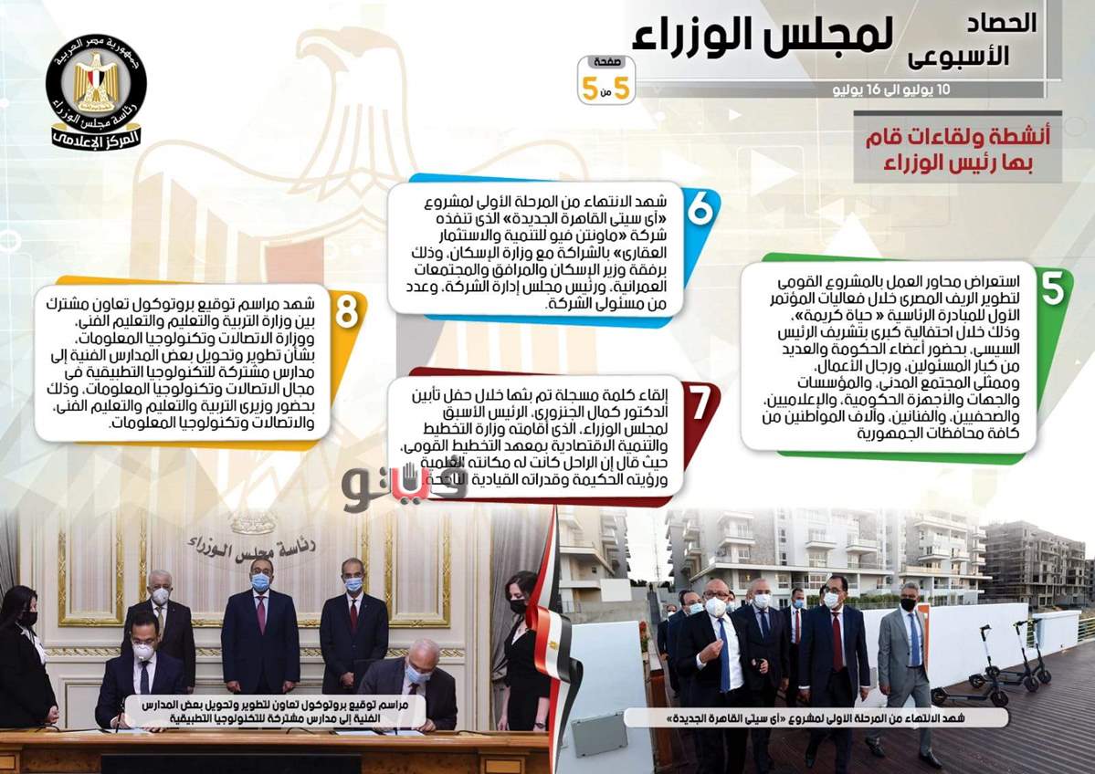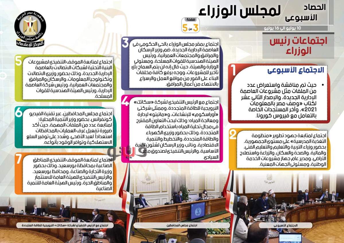 نشر المركز الإعلامي لمجلس الوزراء، تقريراً شمل إنفوجرافات سلط من خلالها الضوء على الحصاد الأسبوعي لمجلس الوزراء، وذلك خلال الفترة من 10 حتى 16 يوليو 2021، والذي تضمن الموافقة على عدد من القرارات، فضلاً عن الاجتماعات التي عقدها الدكتور مصطفى مدبولي، رئيس مجلس الوزراء، بالإضافة إلى ما قام به من أنشطة.