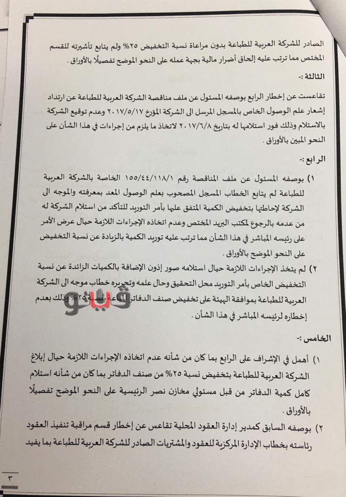 ولم يتابع أحمد نادر محمد، موظف بإدار العقود والمشتريات بوصفه المسئول عن ملف مناقصة الشركة العربية للطباعة رقم 1/118/44/155، الخطاب المسجل المصحوب بعلم الوصول المعد بمعرفته والموجه للشركة لإحاطتها بتخفيض الكمية المتفق عليها بأمر التوريد مما ترتب عليه توريد الكمية بالزيادة عن نسبة التخفيض، ولم يتخذ اللازم حيال استلام صور اذون إضافة الكميات الزائدة، وذلك بعد إخطاره رئيسه المباشر