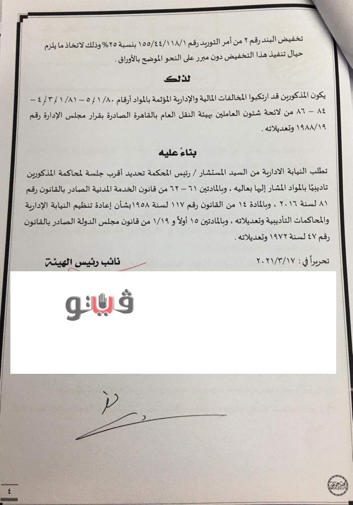 قررت النيابة الإدارية في الدعوى التأديبية رقم 94 لسنة 63 قضائية عليا إحالة مدير عام إدارة العقود والمشتريات بهيئة النقل العام بالقاهرة و4 مسئولين آخرين للمحاكمة العاجلة بتهمة ارتكاب مخالفات مالية وإدارية جسيمة ترتب عليها الإضرار بالمال العام