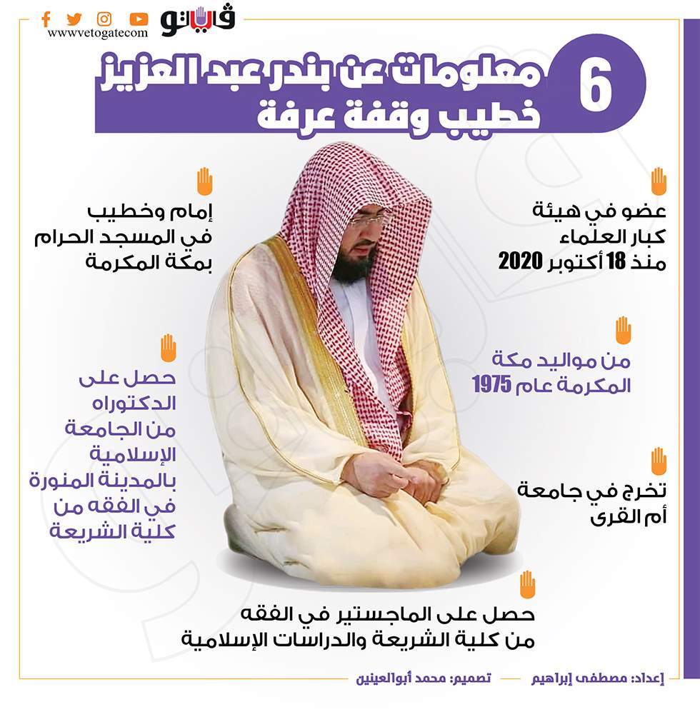 6 معلومات عن بندر عبد العزيز خطيب وقفة عرفة | إنفوجراف السبت 17/يوليو/2021 - 03:04 م 7/17/2021 3:04:43 PM موسم الحج مصطفى إبراهيم شارك طباعة 18 حجم الخط شارك طباعة موسم الحج وقفة عرفات عبدالعزيز بن بندر