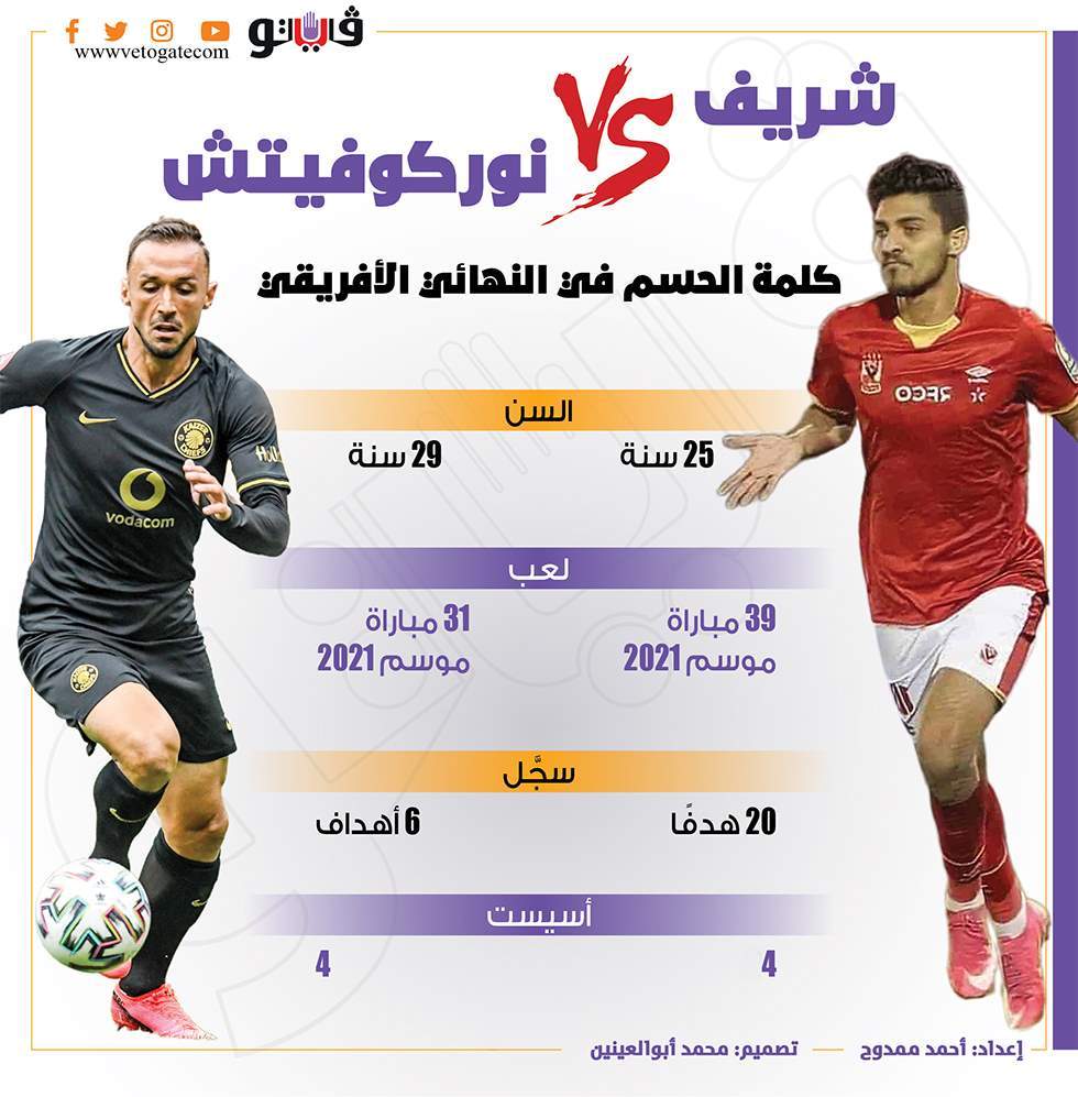 شريف VS نوركوفيتش.. كلمة الحسم في النهائي الأفريقي| إنفو جراف السبت 17/يوليو/2021 - 03:04 م 7/17/2021 3:04:32 PM سمير أحمد ممدوح شارك طباعة 18 حجم الخط شارك طباعة الأهلي نهائي افريقيا كايزر تشيفز