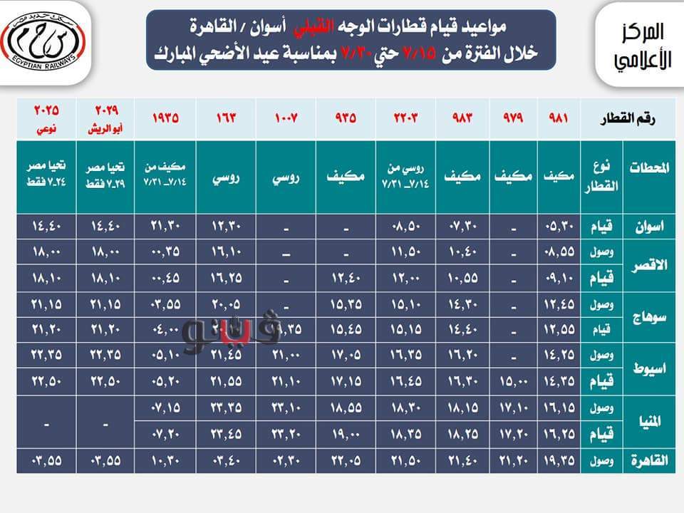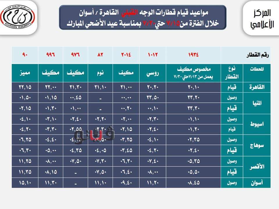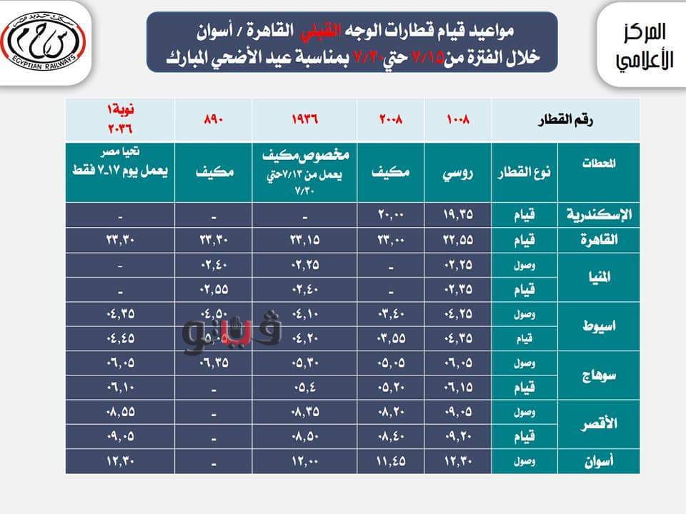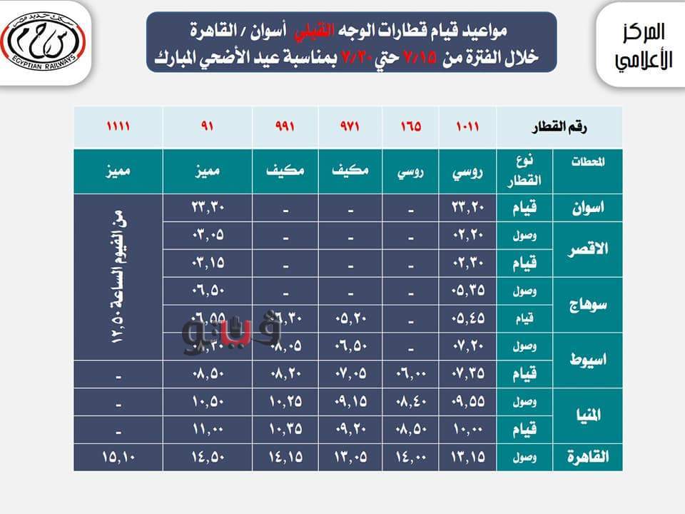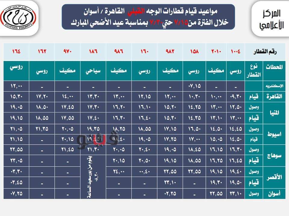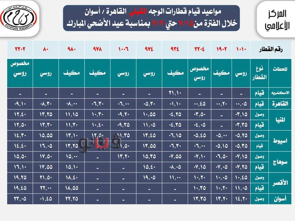 السكك الحديد بعض مواعيد القطارات خلال عيد الأضحى المبارك.