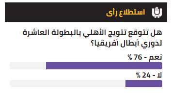 وكانت بوابة "فيتو" أطلقت استطلاع رأي لتوقعات قرائها عن مدى إمكانية الأهلي في التتويج بالبطولة الإفريقية العاشرة، وجاء في الاستطلاع "هل تتوقع تتويج الأهلي بالبطولة العاشرة لدوري أبطال أفريقيا"، وتوقع 76% من القراء فوز الأهلي بالبطولة العاشرة لدوري أبطال إفريقيا.