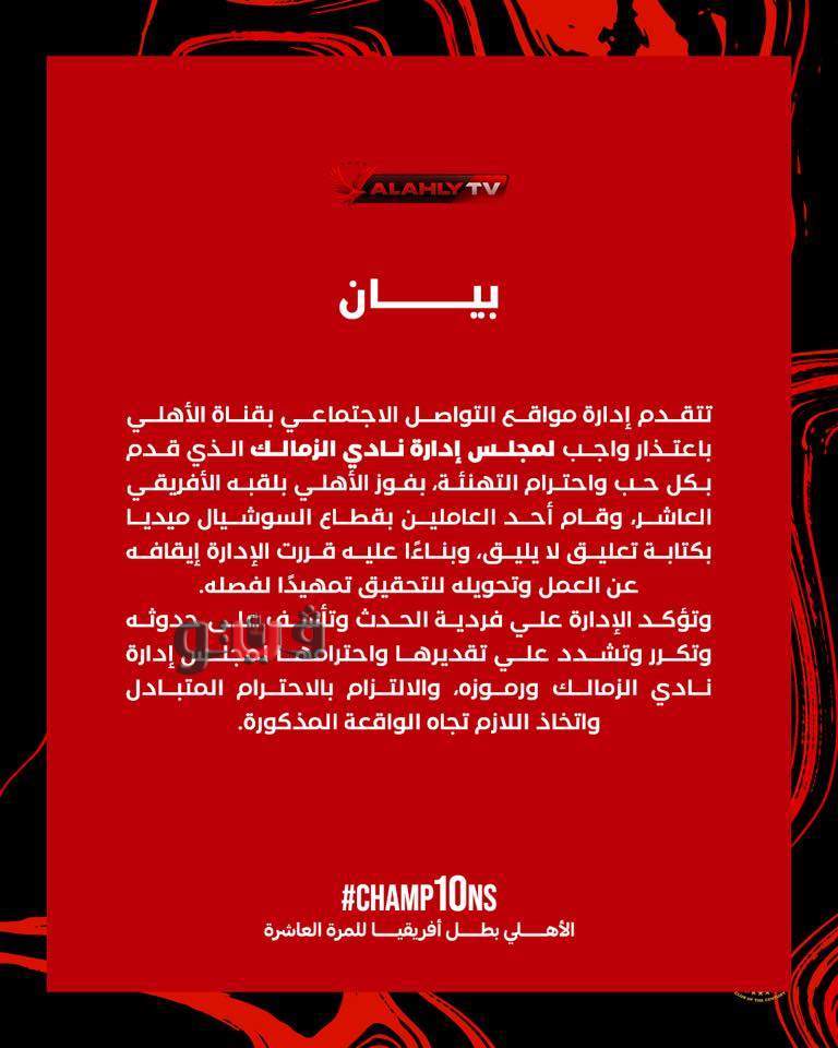 النادي الأهلي يعتذر للزمالك: إحالة عامل بقطاع السوشيال للتحقيق