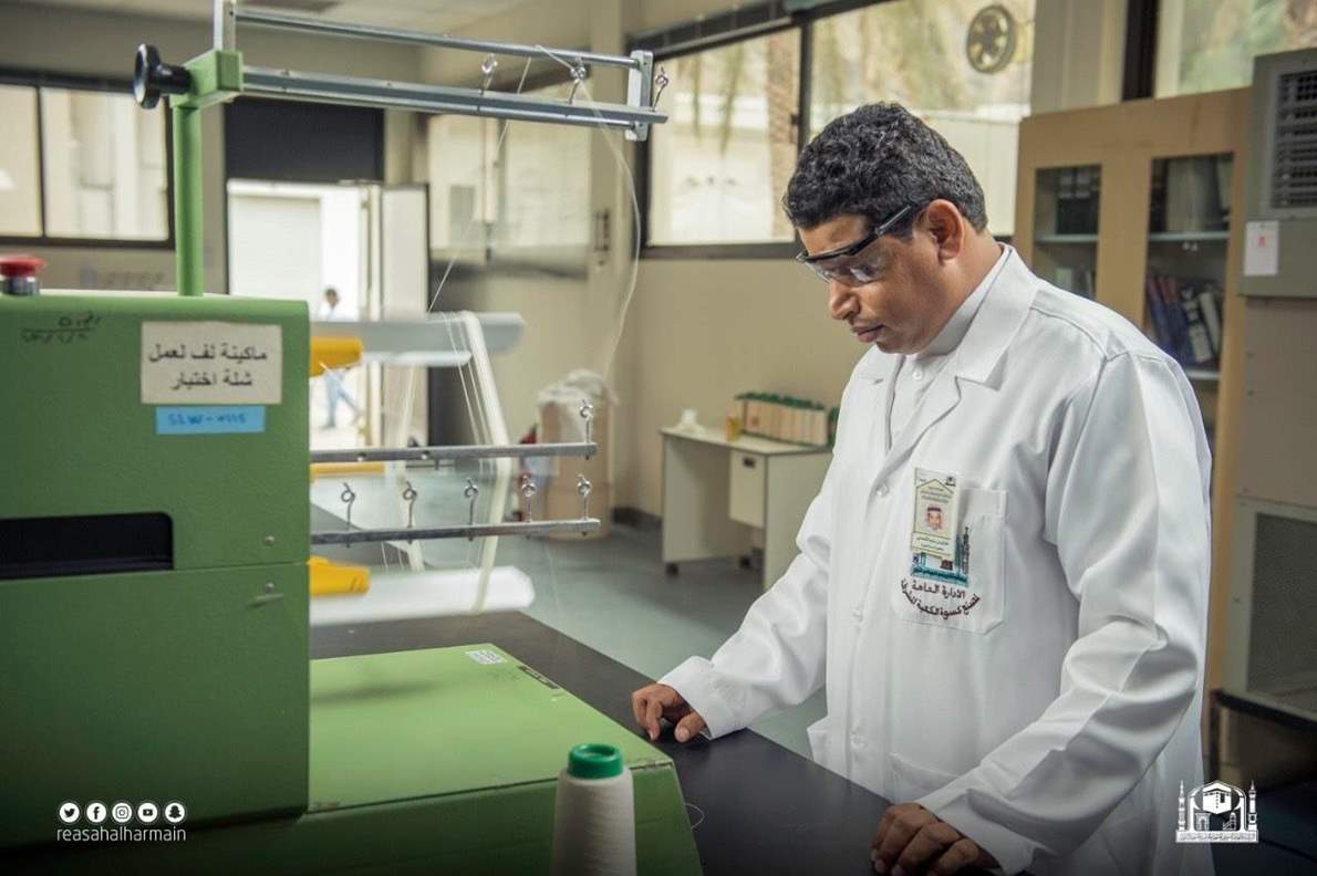 وأضافت الرئاسة: "يعد المختبر الخاص بتحليل جودة كسوة البيت العتيق، والتي تشرف عليه الرئاسة العامة لشؤون المسجد الحرام والمسجد النبوي، الكائن بمجمع الملك عبد العزيز لكسوة الكعبة المشرفة، أحد شواهد العصر على العناية والرعاية الفائقة التي توليها حكومة المملكة العربية السعودية في خدمة بيت الله الحرام، حيث جلبت أحدث الأجهزة والمعدات والمعامل الكيميائية الخاصة بتحليل خيوط الحرير والقطن الخام، والأنواع المختلفة من المنسوجات وعينات المعادن النفيسة"، لافتة إلى أنه "تتعدد أنواع العينات وطرق اختبار مدى جودتها، من خلال أجهزة مخصصة لكل عينة، للتحقق من مدى قوة التحمل وجودة الألوان والأصباغ، ويتم أخذ العينات بطريقة عشوائية من خلال عدة مراحل هي أخذ عينات لخيوط الحرير الخام، يتم أخذها أيضا عند وصول دفعات الحرير الخام للمجمع، ثم أخذ عينات الحرير المصبوغ من قسم المصبغة، وتتضمن 24 دفعة للثوب، و12 دفعة لصيانة الثوب، وعينات القطن الخام التي يتم أخذها عند ورود القطن للمجمع، ثم عينات القطن المصبوغ باللون الأصفر، التي تؤخذ حسب الدفعات المنتجة بعد صباغتها في قسم المصبغة، وعينات المعادن النفيسة للذهب والفضة عند ورودها للمجمع، التي تستخدم في تطريز مذهبات ثوب الكعبة، وعينات المنسوج، التي تنقسم إلى عينات المنسوج السادة، وعينات المنسوج المنقوش".