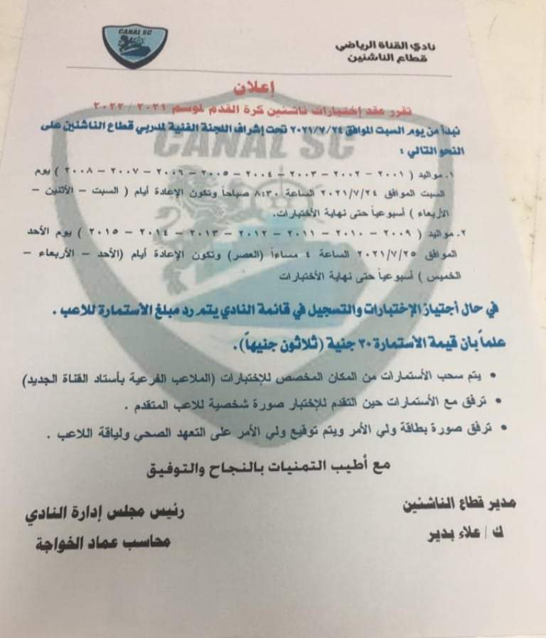 أعلن نادي القناة عن موعد اختبارات الناشئين لكرة القدم والتي ستكون بداية من يوم السبت المقبل ٢٤ يوليو.
