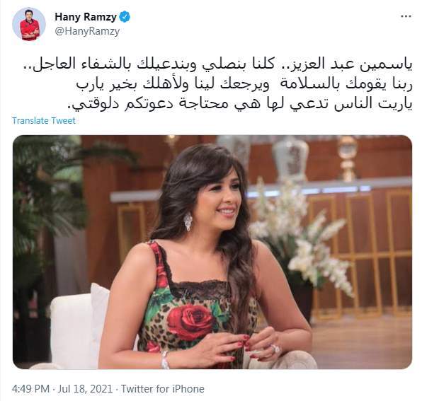 وكتب هاني رمزي قائلا: "كلنا بنصلي وبندعيلك بالشفاء العاجل.. ربنا يقومك بالسلامة ويرجعك لينا ولأهلك بخير يارب ياريت الناس تدعي لها هي محتاجة دعواتكم دلوقتي".