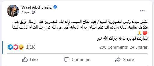 وكتب وائل عبدالعزيز، عبر حسابه الخاص على «فيس بوك»: «نشكر الرئيس عبدالفتاح السيسي والد لكل المصريين على إرسال فريق طبي متكامل لمتابعة الحالة والإشراف على أطباء إجراء العملية، آملين من الله عز وجل الشفاء العاجل لبنتنا، دعواتكم في يوم عرفة جزاكم الله خير».