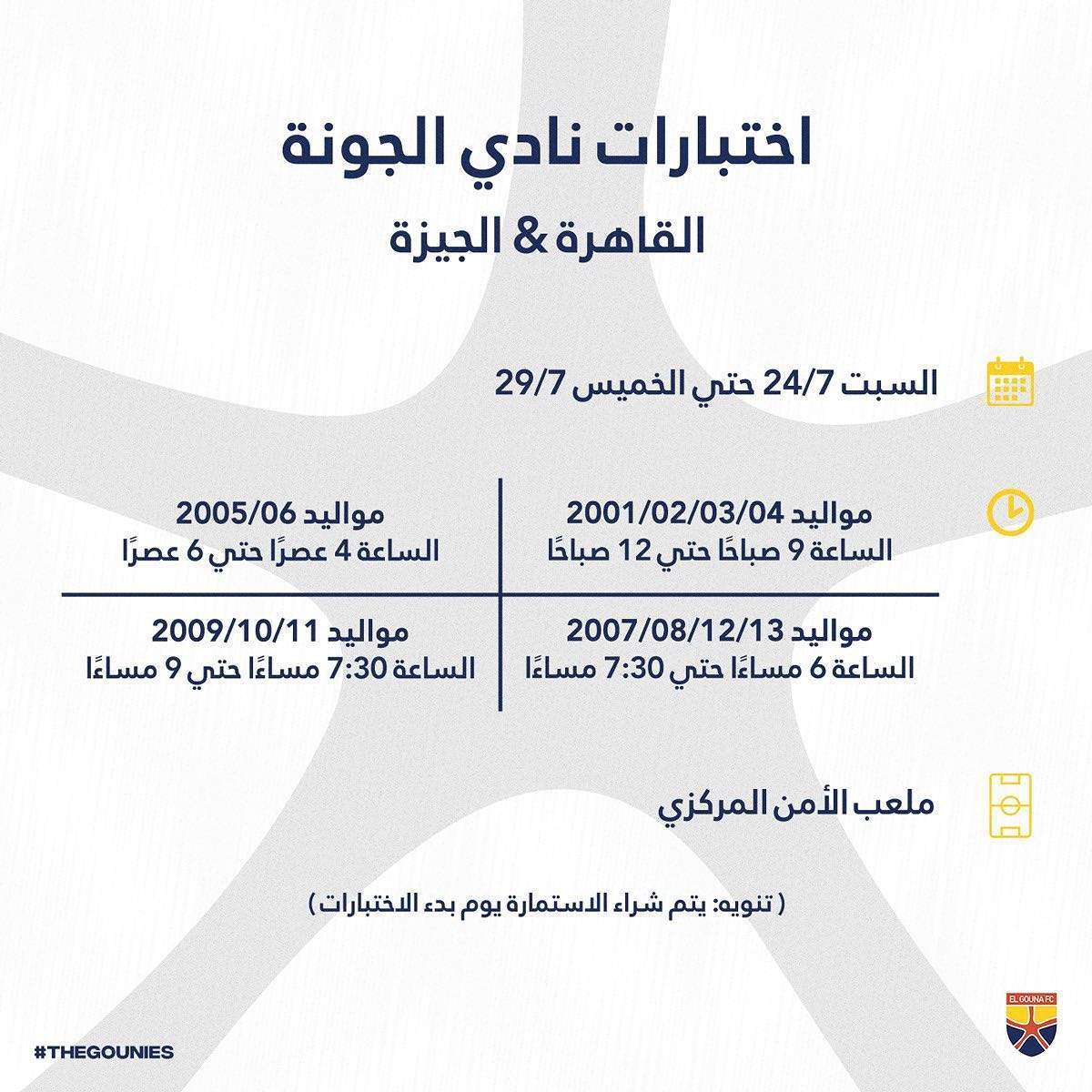 وتنطلق اختبارات الناشئين بنادي الجونة من مواليد 2001 حتي 2004 ، بداية من الساعة 9 ص حتي 12 ظهرا ، ومن مواليد 2005 و2006 بداية الساعة الرابعة عصرا حتي السادسة مساءا ، وتقام اختبارات مواليد 2007 و2008 و2012 و2013 بداية من السادسة مساءا حتي السابعة والنصف مساءا، فيما تقام اختبارات مواليد 2009 و2010 و2011 بداية من السابعة والنصف مساءا حتي التاسعة مساءا.