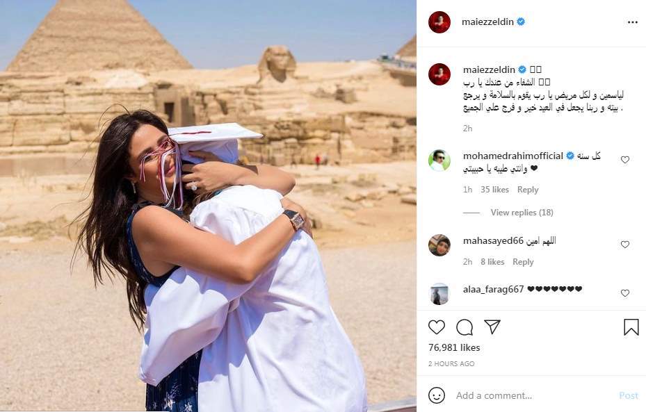 وكتبت مي عز الدين عبر حسابها بإنستجرام: "الشفاء من عندك يا رب.. لياسمين ولكل مريض يا رب يقوم بالسلامة ويرجع بيته وربنا يجعل في العيد خير وفرج على الجميع".