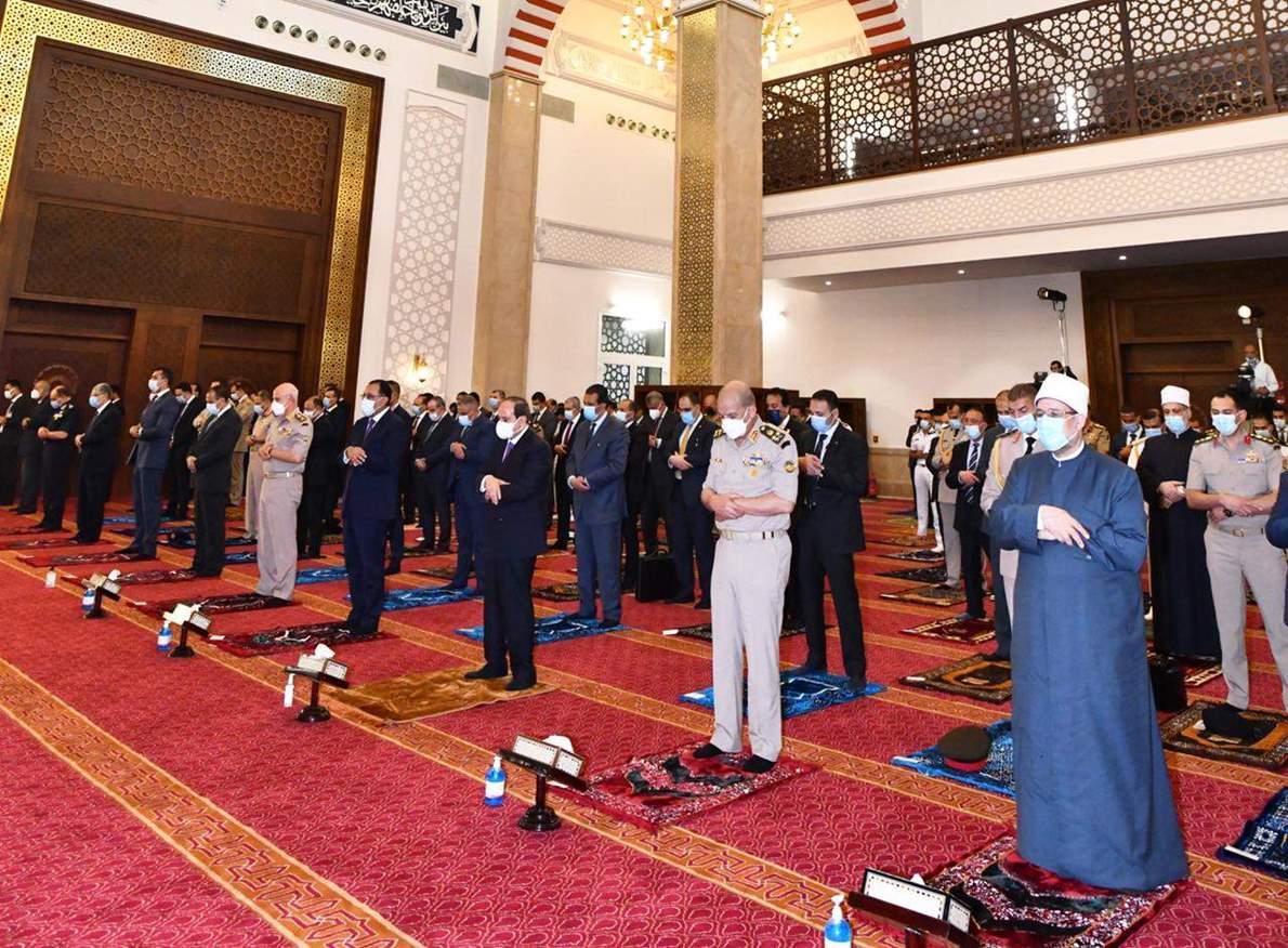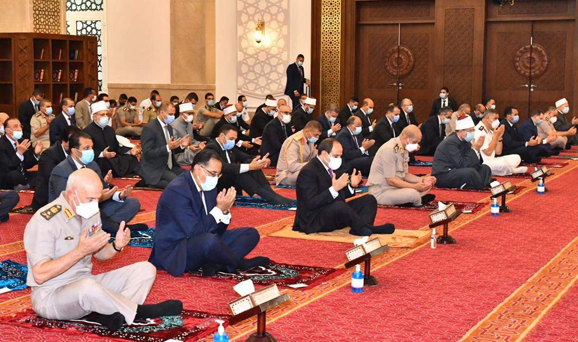 قال السفير بسام راضي المتحدث الرسمي باسم رئاسة الجمهورية : أدى صباح اليوم الرئيس عبد الفتاح السيسى والدكتور مصطفى مدبولى رئيس مجلس الوزراء والفريق أول محمد زكي القائد العام للقوات المسلحة وزير الدفاع والانتاج الحربى، والفريق محمد فريد رئيس اركان حرب القوات المسلحة، والسادة قادة الأفرع الرئيسية للقوات المسلحة، وعدد من الوزراء، وكبار رجال الدولة صلاة عيد الاضحي المبارك بمسجد مالك الملك بمدينة العلمين الجديدة
