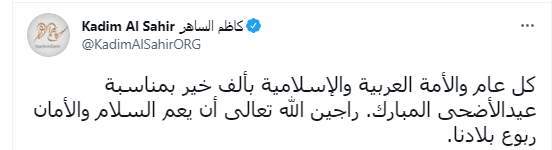 وكتب كاظم الساعر تغريدة على تويتر " كل عام والأمة العربية والإسلامية بألف خير بمناسبة عيدالأضحى المبارك. راجين الله تعالى أن يعم السلام والأمان ربوع بلادنا"