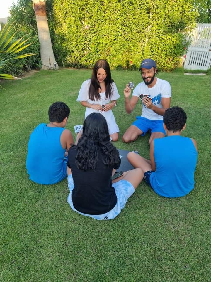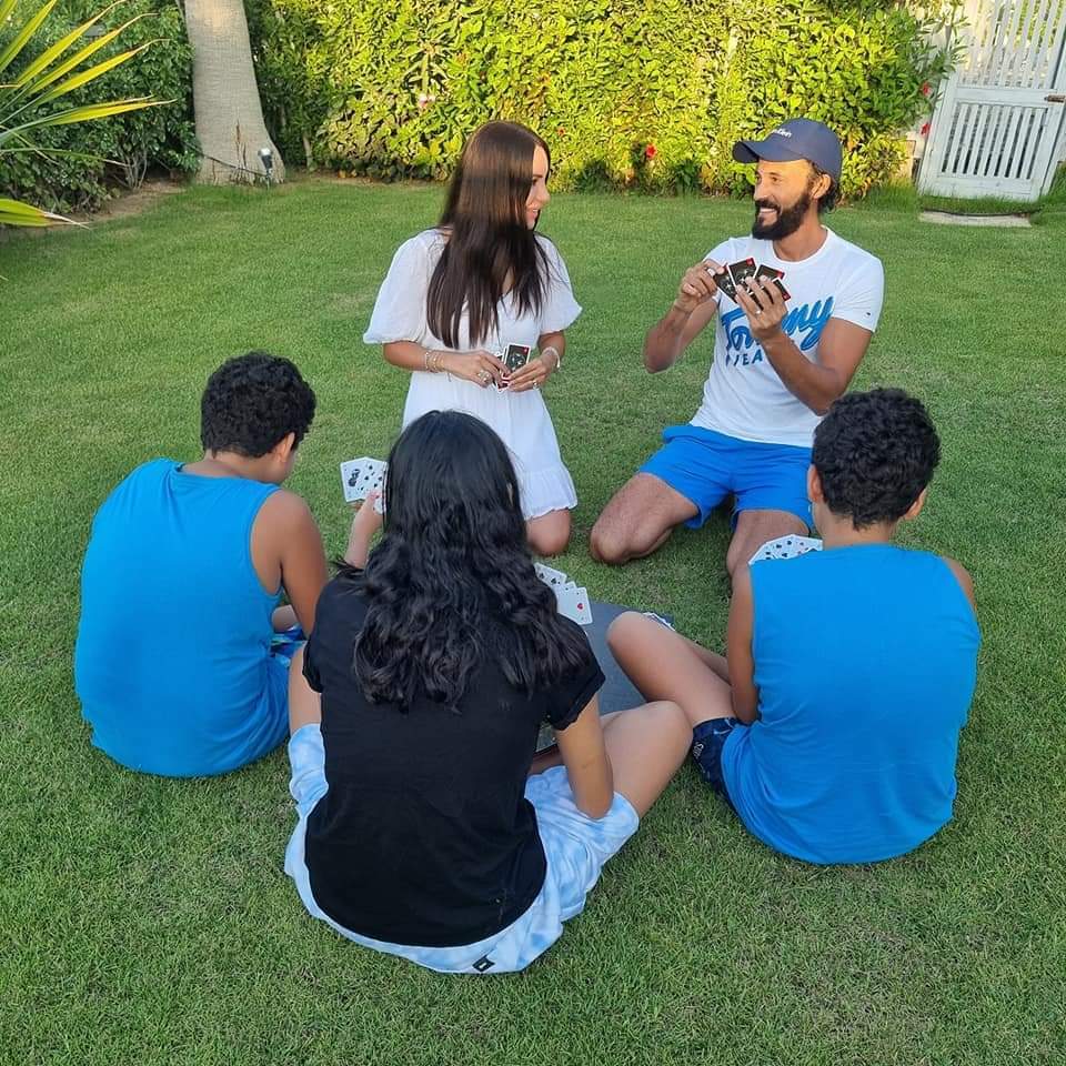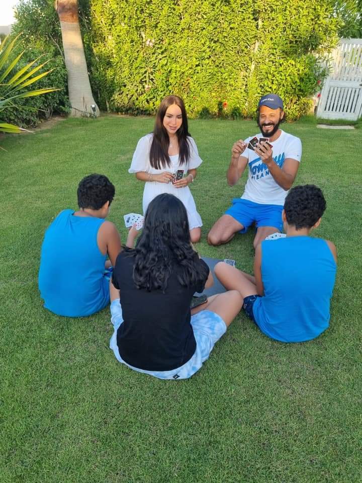 وظهروا في الصور التي نشرتها «إنجي» عبر حسابها الشخصي علي موقع التواصل الاجتماعي «فيس بوك» في حديقة منزلهم يستمتعون بوقتهم ويلعبون كوتشينة.