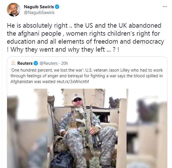 وكتب نجيب ساويرس تغريدة على تويتر قال فيها: "إنه محق تمامًا.. الولايات المتحدة والمملكة المتحدة تخلتا عن الشعب الأفغاني وحقوق المرأة وحق الأطفال في التعليم وكل عناصر الحرية والديمقراطية! لماذا ذهبوا ولماذا رحلوا...؟!".