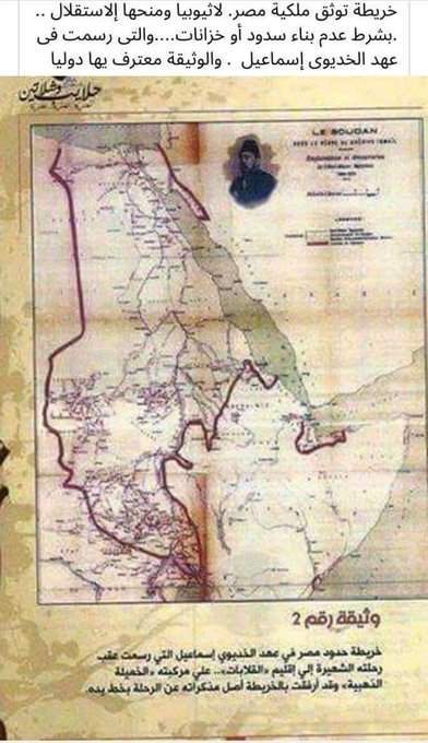 وكشف منتصر بدري عن خريطة لملكية مصر لأرض أثيوبيا وقال "خريطة توثق ملكية مصر لأثيوبيا ومنحها الاستقلال بشرط عدم بناء سدود أو خزانات.. والتي رسمت في عهد الخديوي إسماعيل والوثيقة معترف بها دوليا"، مؤكدًا أن الخريطة رسمت عقب رحلة الخديوى إسماعيل إلى إقليم "القلابات.. على مركبته "الخميلة الذهبية" وأرفقت بالخريطة أصل مذكراته عن الرحلة بخط يده".