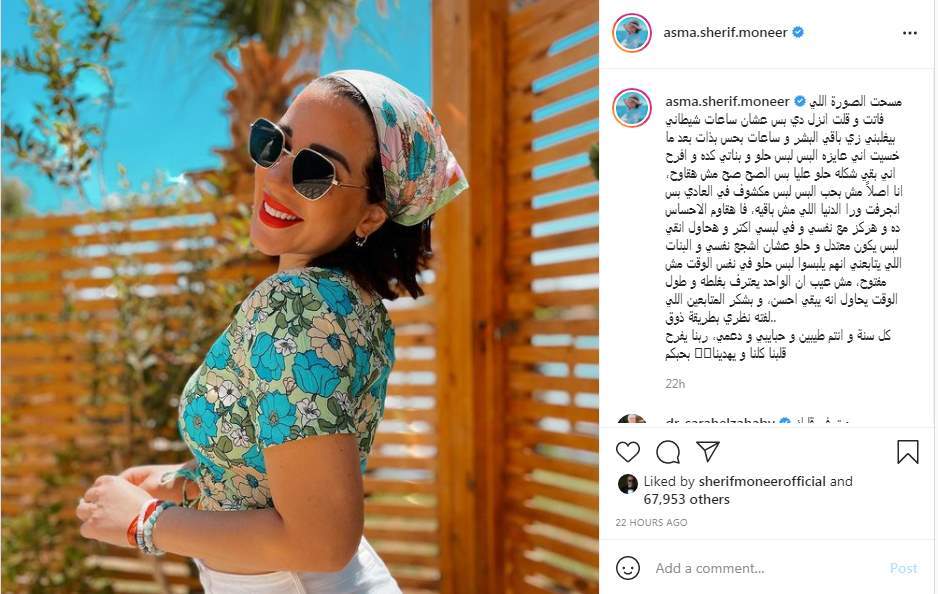 وقالت عبر حسابها الشخصي على موقع التواصل الاجتماعي لتبادل الصور والفيديوهات الشهير "إنستجرام": "مسحت الصورة اللي فاتت وقلت أنزل دي، بس عشان ساعات شيطاني بيغلبني زي باقي البشر وساعات بحس بالذات بعد ما خسيت أني عايزة ألبس لبس حلو وبناتي كده وأفرح أني بقى شكله حلو عليا بس الصح صح مش هقاوح".
