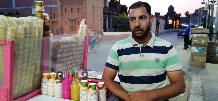 وتابع: "اتجول بعربتي في مختلف الأماكن علي الكورنيش وأمام قاعة الأفراح وذلك في أيام الأعياد والمناسبات المختلفة، والآيس كريم باطعمة مختلفة منها الفانيليا والفراولة والموز والمانجو وغيره وجميعها طازة واحرص دائما علي النظافة".