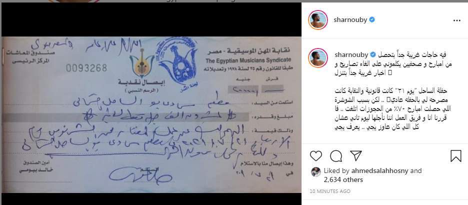 وكتب محمد الشرنوبي على إنستجرام "فيه حاجات غريبة جداً بتحصل من إمبارح و صحفيين يكلموني عن إلغاء تصاريح وأخبار غريبة جداً بتنزل.. حفلة الساحل ”يوم ٢١“ كانت قانونية والنقابة كانت مصرحة لي بالحفله عادي.. لكن بسبب الشوشرة اللي حصلت إمبارح ٧٠٪ من الحجوزات اتلغت.. فقررنا أنا وفريق العمل اننا نأجلها ليوم تاني عشان كل اللي كان عاوز ييجي.. يعرف ييجي"