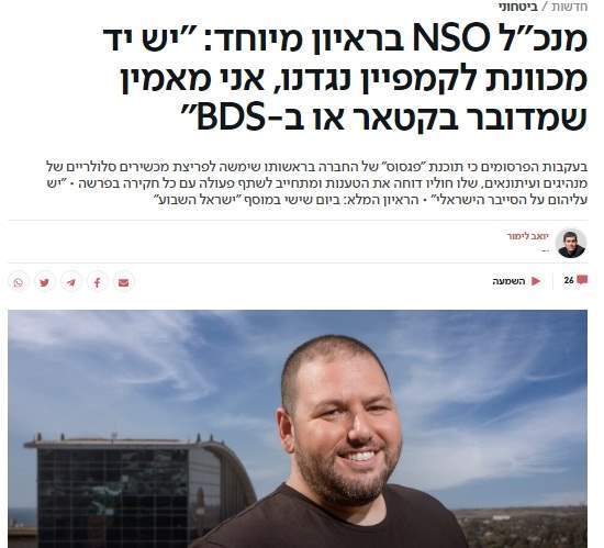 زعم مدير شركة NSO الإسرائيلية، المالكة لبرنامج "بيجاسوس" للتجسس، شاليف حوليو إن هناك يدا توجه الحملة الأخيرة ضد إسرائيل أعتقد أنها قطر أو حركة المقاطعة الدولية BDS.