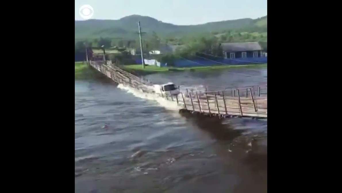 ويظهر في الفيديو لحظة انهيار جسر فوق مجرى مائي امتلأ بكميات كبيرة من المياه بفعل فيضان كبير.
