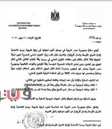وخاطبت وزارة الطيران المدني سفارة مصر في موسكو ووزارة خارجية روسيا الاتحادية لتعيين شركة فلاي إيجيبت كناقل منتظم لدى سلطات الطيران المدني في روسيا.