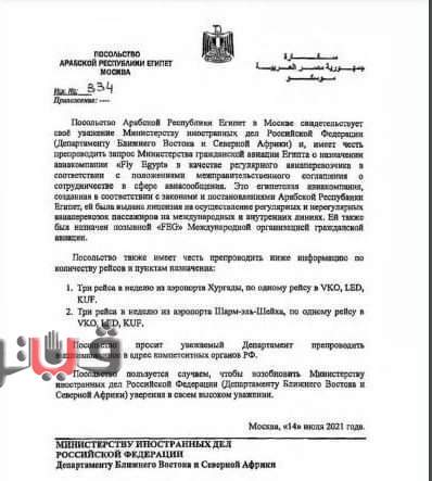 وتضمن خطاب وزارة الطيران المدني الموجهة إلى السفارة المصرية في روسيا ووزارة خارجية روسيا الاتحادية، اعتزام شركة فلاي إيجيبت تشغيل خط جوي بمعدل 3 رحلات أسبوعياً من مطاري شرم الشيخ والغردقة إلى 3 مدن روسية تشمل مطارات كل من « فنوكوفو في موسكو، وبولكوفو في سان بطرسبرج وكوروموخ الدولي في سامارا» .