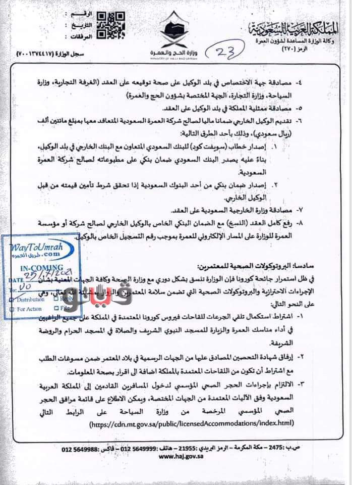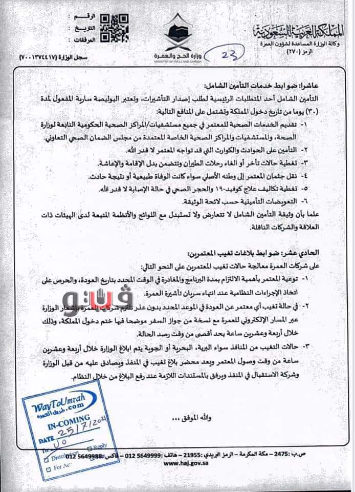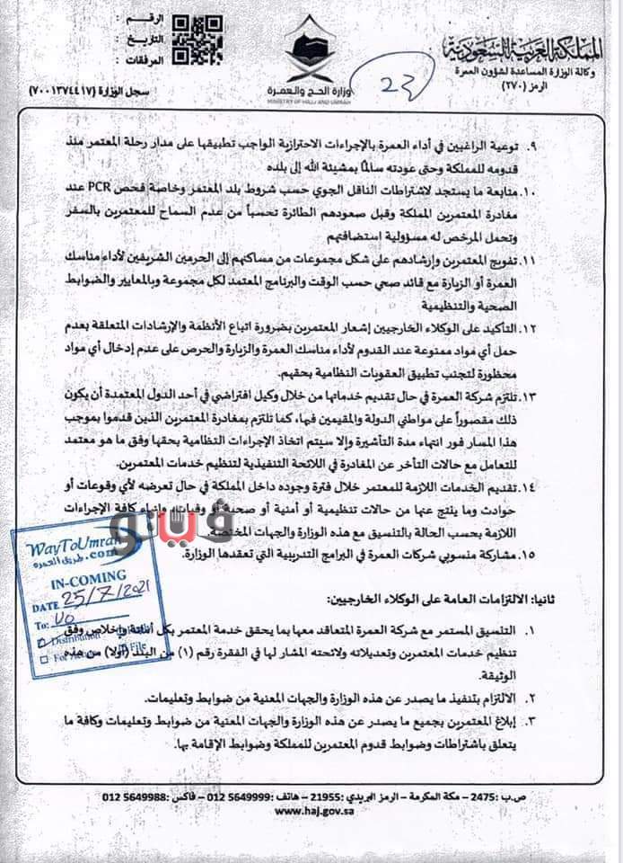 واشترطت الممكلة أن يكون الراغب في أداء المناسك حصل علي جرعات لقاحات كورونا المعتمدة من السلطات الصحية هناك، مع إرفاق شهامة التحصين المصدق عليها من الجهات الرسمية في بلاد المعتمر ضمن مصوغات طلب أداء مناسك العمرة والزيارة بالمسجد النبوي، مع الالتزام بالحجر الصحي المؤسسي لدخول المسافرين إلى الممكلة العربية السعودية.