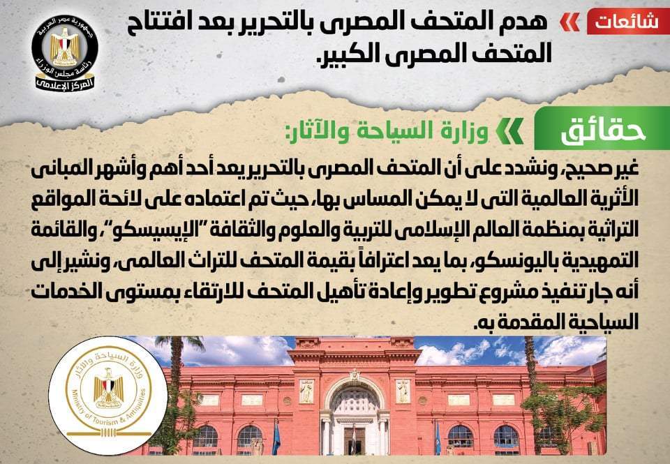 وقام المركز الإعلامي لمجلس الوزراء بالتواصل مع وزارة السياحة والآثار، والتي نفت تلك الأنباء، مُؤكدةً أنه لا صحة لهدم المتحف المصري بالتحرير بعد افتتاح المتحف المصري الكبير، مُشددةً على أن المتحف المصري بالتحرير يعد أحد أهم وأشهر المباني الأثرية العالمية التي لا يمكن المساس بها، حيث تم اعتماده على لائحة المواقع التراثية بمنظمة العالم الإسلامي للتربية والعلوم والثقافة "الإيسيسكو" والقائمة التمهيدية باليونسكو، بما يعد اعترافاً بقيمة المتحف للتراث العالمي، مُشيرةً إلى أنه جارٍ تنفيذ مشروع تطوير وإعادة تأهيل المتحف للارتقاء بمستوى الخدمات السياحية المقدمة به.