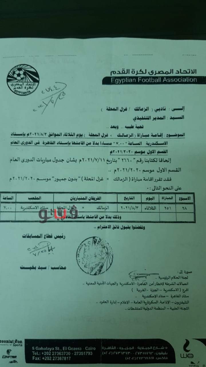 تلقي نادي غزل المحلة فاكسا رسميا من الاتحاد المصري لكرة القدم يفيد