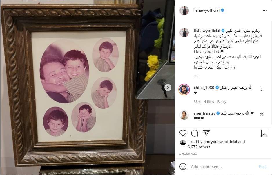 ونشر أحمد الفيشاوي صورا تجمعه بوالده الراحل معلقا عليها بالقول: "ذكرى سنوية الفنان الكبير فاروق الفيشاوي.. شكراَ على كل مرة ساعدتني فيها، شكراً علي تعليمي، شكراً علي تربيتي، شكراً علي كرمك وحنانك مع كل الناس.. I love you dad الفجوة اللي في قلبي هتعد تكبر لحد ما أشوفك بخير.. وحشتني يا أصيل يا محترم.. أه وأخيرا شكراً على فرحتك بيا".