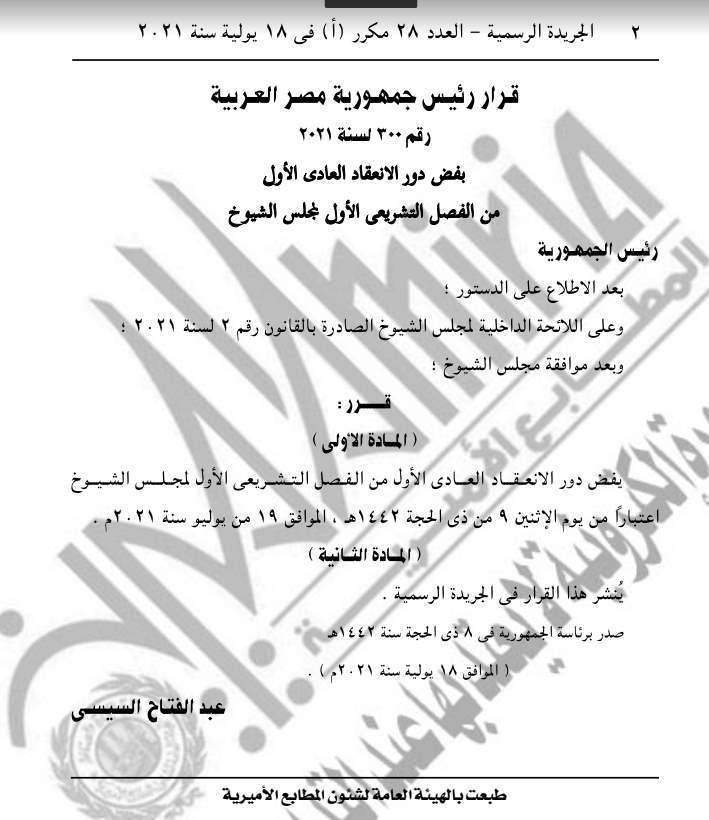 ونشر القرار فى الجريدة الرسمية حيث حمل رقم 300 لسنة 2021، ونشر في العدد 28 مكرر (أ)، بفض دور الانعقاد الأول.