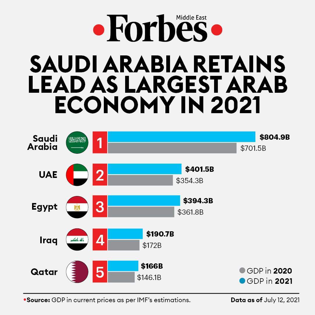 حلت مصر في المركز الثالث، بين أكبر 5 قوى اقتصادية عربية بعد السعودية والإمارات، وفقًا لتصنيف مجلة "فوربس" الشرق الأوسط.