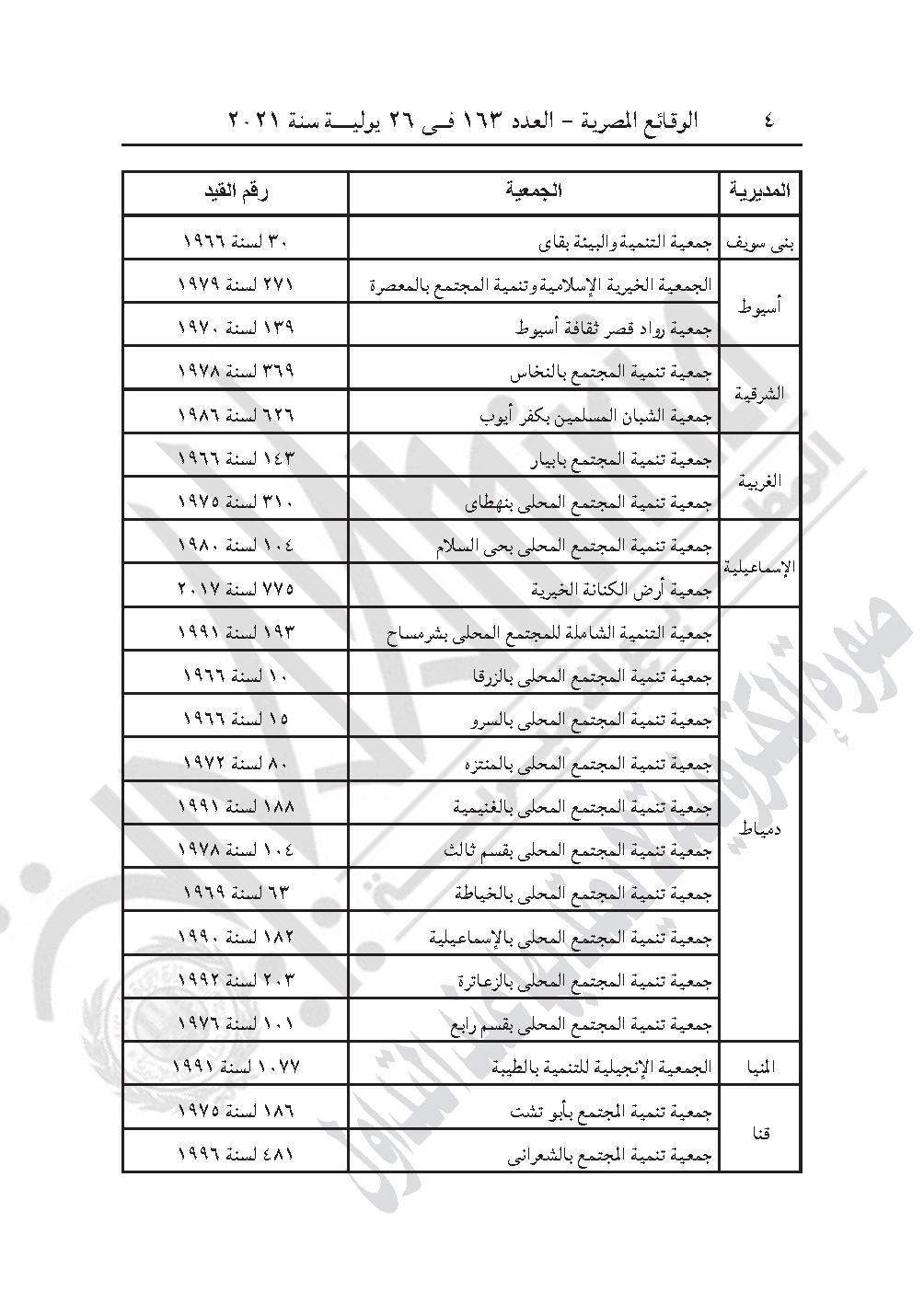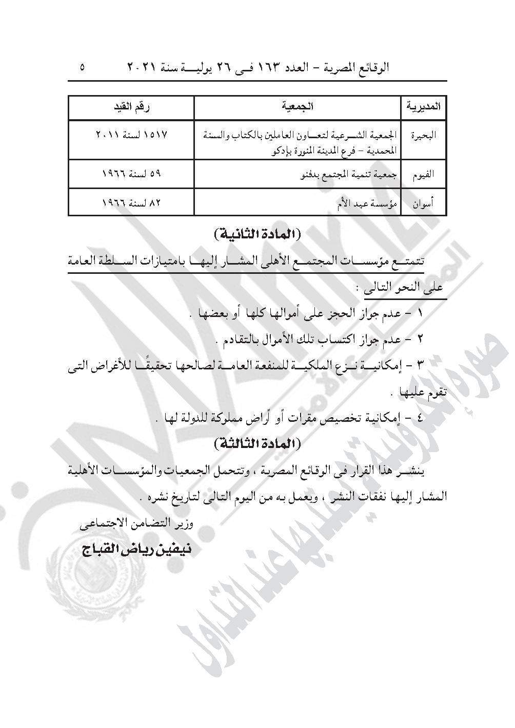 نشرت جريدة الوقائع المصرية في عددها رقم 163، الصادر في 26 يوليه 2021، قرار وزارة التضامن الاجتماعي رقم 244 لسنة 2021، بإضفاء صفة النفع العام على 27 من مؤسسات المجتمع الأهلى في 13 محافظة.