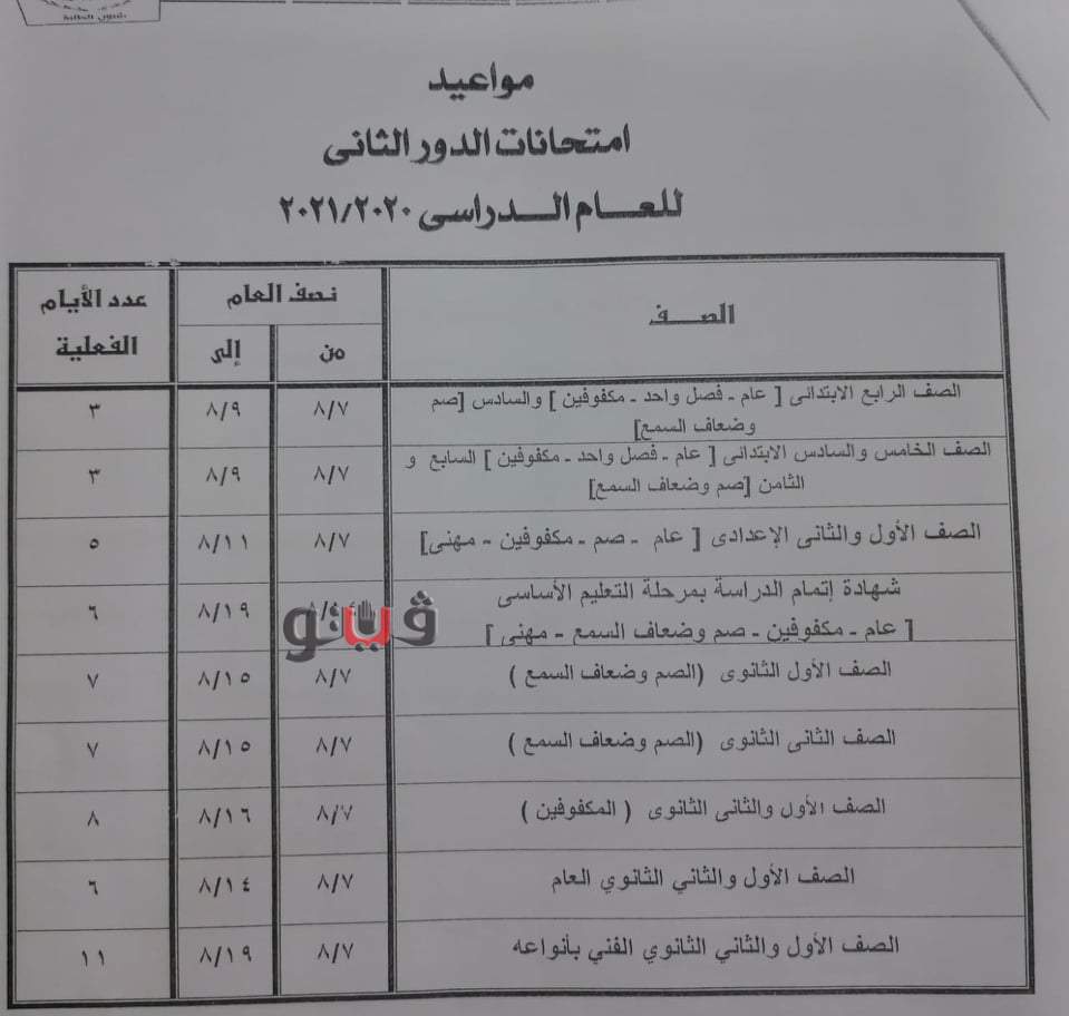 ثانيا / الصف الخامس والسادس الابتدائي ( عام وفصل واحد ومكفوفين ) والسابع والثامن ( صم وضعاف سمع ) خلال الفترة من 7 إلى 9 أغسطس 2021 .