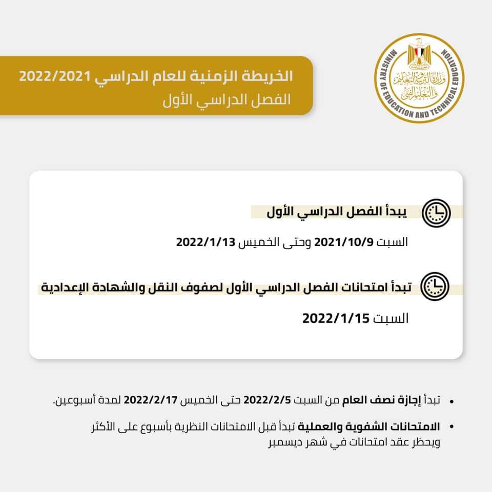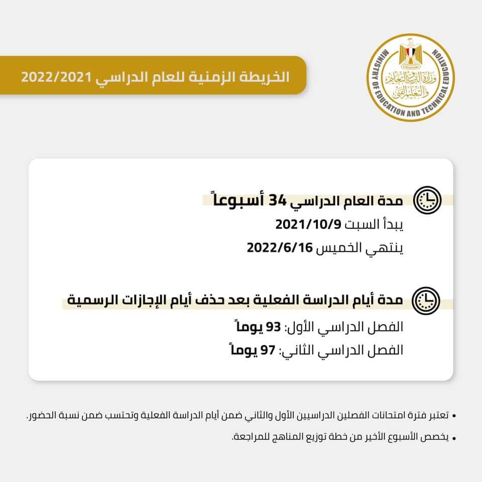 يبدأ العام الدراسي يوم السبت ٩/ ١٠/ ٢٠٢١ وينتهي يوم الخميس ١٦/ ٦/ ٢٠٢٢ ويستمر لمدة ٣٤ أسبوع، وتكون مدة أيام الدراسة الفعلية بعد حذف أيام الإجازات الرسمية ٩٣ يوم للفصل الدراسي الأول و٩٧ يوم للفصل الدراسي الثاني، على أن تكون أيام الدراسة الفعلية ١٩٠ يوماً بما يعادل ٣٢ أسبوعاً.