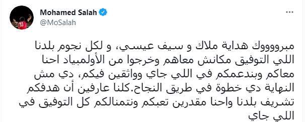 وكتب محمد صلاح تغريدة على تويتر "مبرووووك هداية ملاك وسيف عيسي، ولكل نجوم بلدنا اللي التوفيق مكانش معاهم وخرجوا من الأولمبياد احنا معاكم وبندعمكم في اللي جاي وواثقين فيكم، دي مش النهاية دي خطوة في طريق النجاح. كلنا عارفين أن هدفكم تشريف بلدنا واحنا مقدرين تعبكم ونتمنالكم كل التوفيق في اللي جاي".