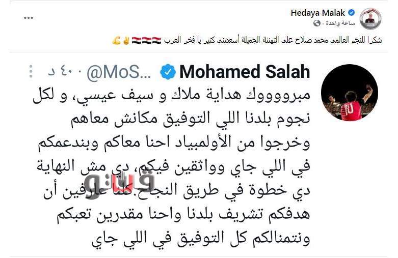 وكتب محمد صلاح تغريدة على تويتر "مبرووووك هداية ملاك وسيف عيسى، ولكل نجوم بلدنا اللي التوفيق مكانش معاهم وخرجوا من الأولمبياد احنا معاكم وبندعمكم في اللي جاي وواثقين فيكم، دي مش النهاية دي خطوة في طريق النجاح، كلنا عارفين أن هدفكم تشريف بلدنا واحنا مقدرين تعبكم ونتمنالكم كل التوفيق في اللي جاي".