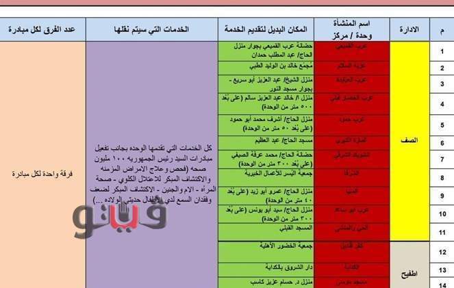 (عرب القميعى) يتم نقلها الى حضانة عرب القميعى بجوار منزل الحاج عبد المطلب حمدان, (عزبة السلام )وسيتم نقلها الى مجمع خالد بن الوليد الطبى ,(عرب العيايدة )وسيتم نقلها الى منزل الشيخ عبد العزيز أبو سريع بجوار مسجد النور ,(عرب الحصار قبلى ) وسيتم نقلها الى منزل أ / خالد عبد العزيز سالم ( على بعد 500 متر من الوحدة )، (عرب حمود ) وسيتم نقلها الى منزل الحاج أشرف محمد أبو حمود (على بعد 50 متر من الوحدة )، (غمازة الكبرى) وسيتم نقلها الى مسجد الحاج عبد العظيم , (الشوبك الشرقي )وسيتم نقلها الى حضانة الحاج محمد عرفة الصيفى ( على بعد 300 متر من الوحدة) , (الشرفا) وسيتم نقلها الى جمعية اليسر للأعمال الخيرية , (المنيا) وسيتم نقلها الى منزل الحاج عمرو أبو زيد ( على بعد 40 مترا من الوحدة ) , (عرب أبو ساعد ) وسيتم نقلها الى منزل الحاج سيد أبو يونس ( على بعد 300 متر من الوحدة ) , (الحى والمنشي ) وسيتم نقلها الى المسجد القبلى.