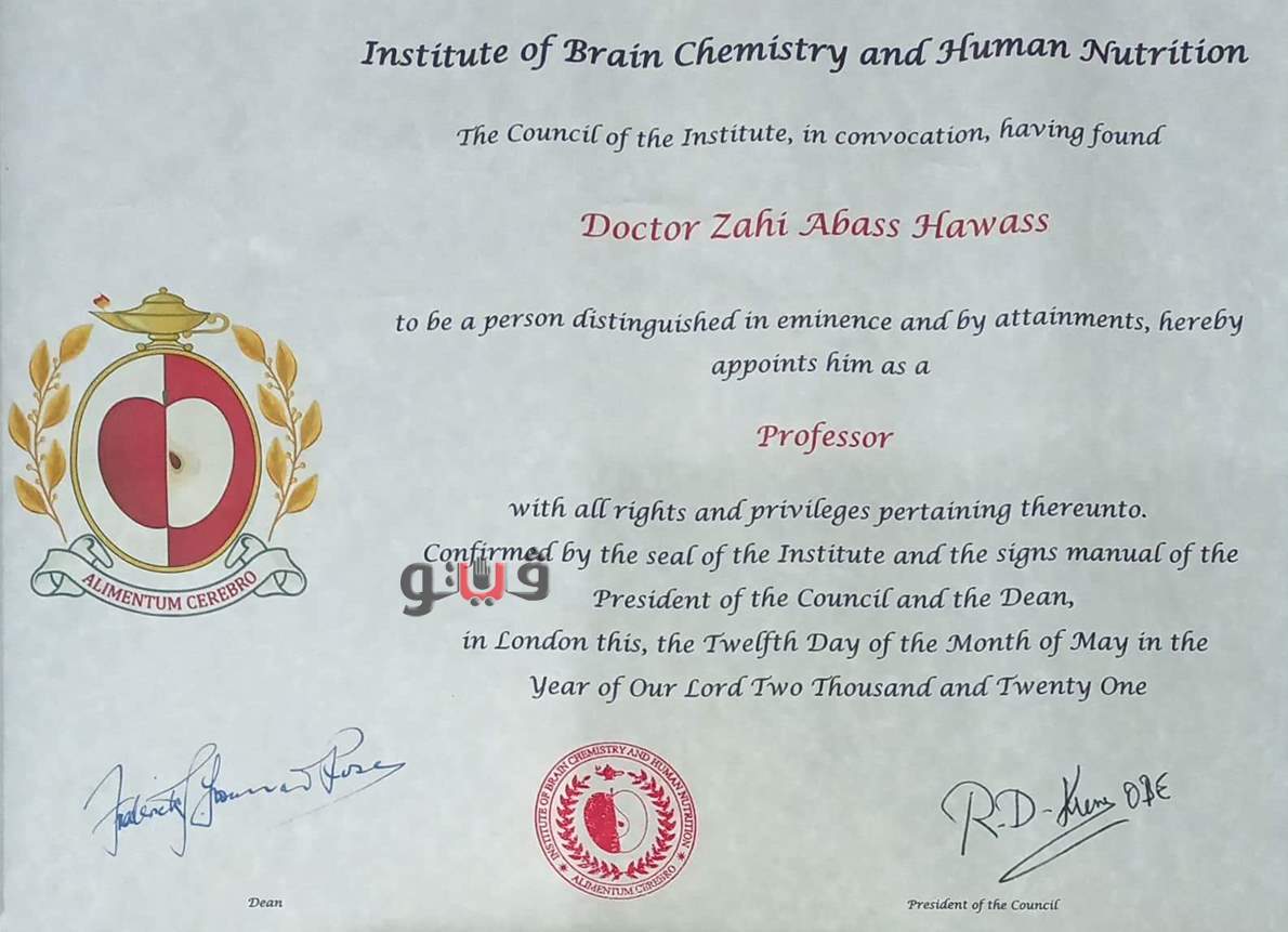قرر معهد "كيمياء الدماغ والتغذية البشرية" بلندن تعيين عالم الآثار المصرية الدكتور "زاهي حواس" أستاذاً بالمعهد.