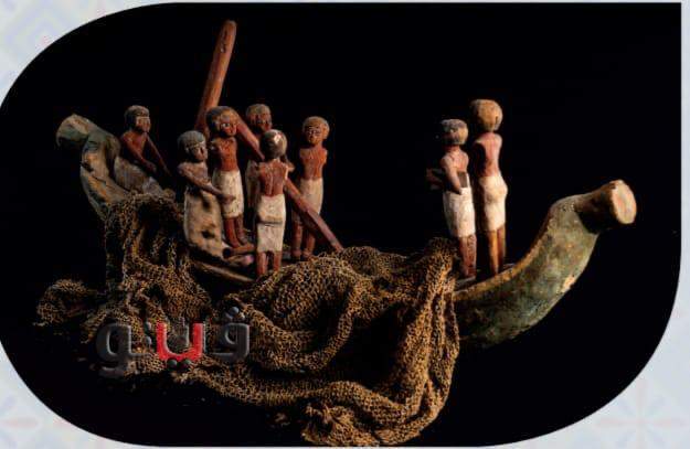 يعرض نموذج لمركب ملونة من الخشب عليها مجموعة من البحارة والصيادين والنموذج يصور عملية الصيد بالشباك .