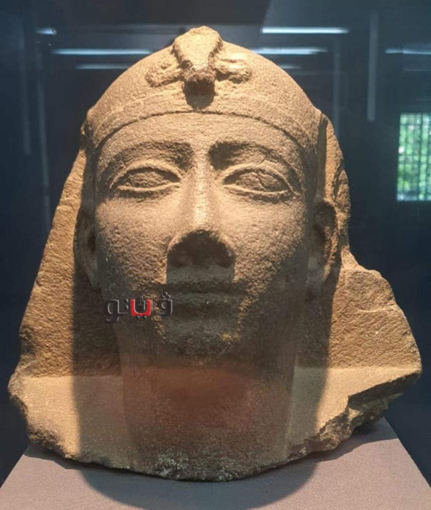يعرض رأس تمثال لملك من الجرانيت الأسود، صور بملامح مثالية بعيون واسعة وانف وفم دقيقين مرتديا غطاء الرأس نمس وتحلي جبهته حيه الكوبرا، التمثال يعود إلى العصر المتأخر .