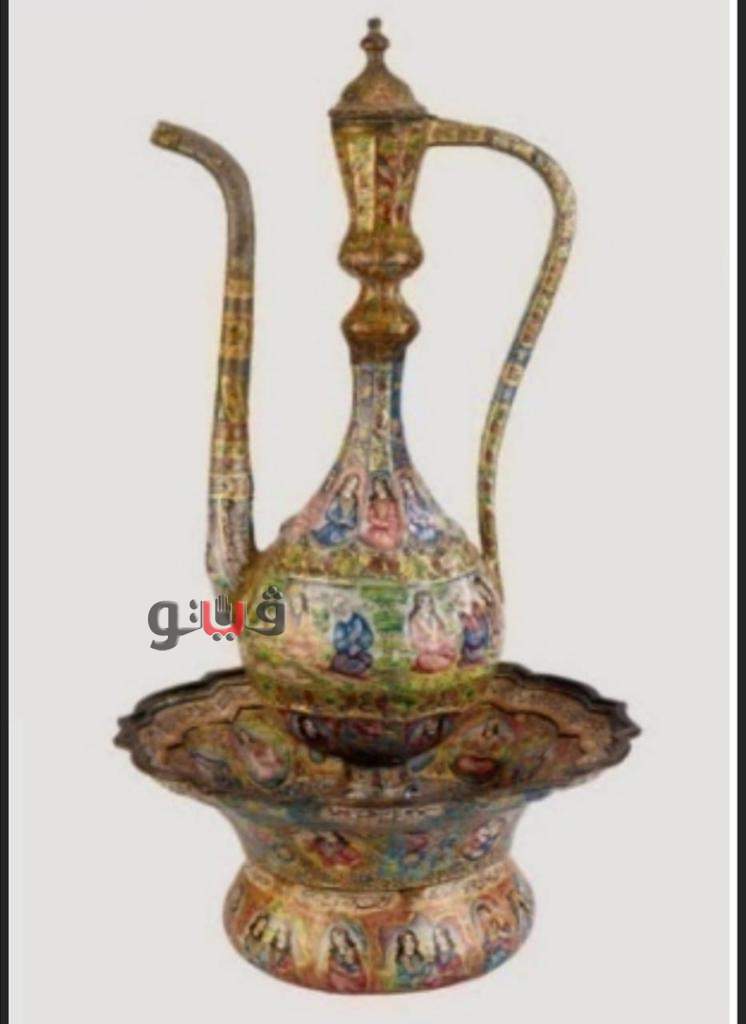 يعرض المتحف إبريق وطست من النحاس مزخرف بموضوعات تصويرية متعددة مأخوذة من قصص الأدب الفارسي ورسوم نباتية متعددة.