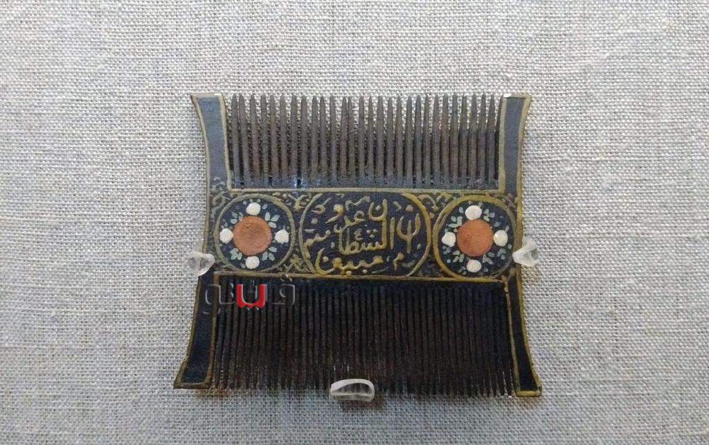 يعرض مشط من الخشب أسود اللون من العصر العثماني، كتب على أحد وجهيه جملة "ان الشيطان عدو مبين" وزخارف نباتية وهندسية ملونة.