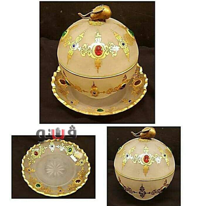 يسلط الضوء على سلطانية من البللور الأبيض كروية الشكل، عليها زخارف نباتية محورة مذهبة بداخلها فصوص باللون الأحمر والأخضر والأزرق، لها غطاء بمقبض من المعدن على شكل ثمرة الكمثرى. وللسلطانية طبق ذو حافة مموجة مذهبة مزين بنفس زخارف السلطانية وترجع لعصر اسرة محمد علي.