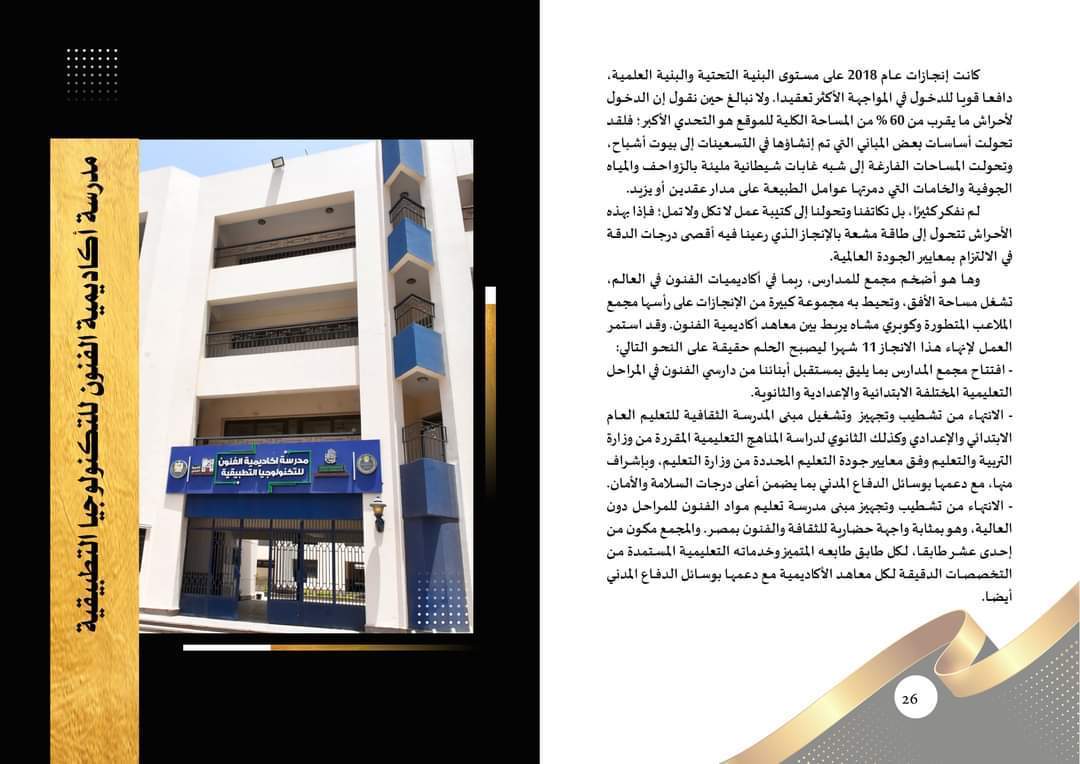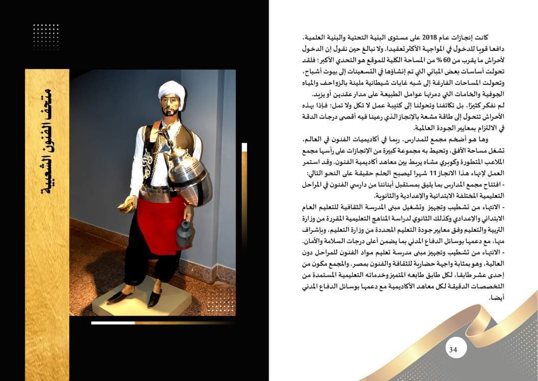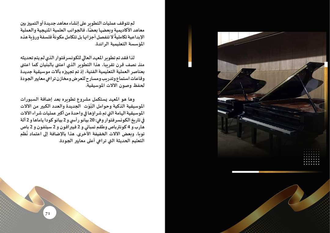 وتضمن الكتيب أيضا الإنجازات التي تحققت على مستويات البنية الأساسية والبنية العلمية والبنية الثقافية والفنية، حيث تم إمداد عدد من المباني التي عانت من الإهمال لسنوات طويلة بكافة التجهيزات، من أثاث وأجهزة ووسائل تعليمية، وتم تشغيلها على الفور لتصبح محط أنظار المتخصصين والمثقفين والمهتمين بالفنون ومناهج دراستها.