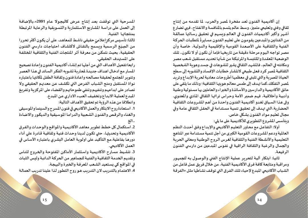 وتناول الكتيب تفاصيل تنشيط مسارح الأكاديمية واستثمار الأماكن المفتوحة، والخروج للناس وتقديم الخدمة الثقافية والفنية للجماهير من الحركة الدائبة وليس الثبات في المواقع، كي يستعيد الشعب المعرفة والخبرة والبهجة، بالإضافة إلى التعاون مع القطاع الخاص وإدخال مفهوم تسويق واستثمار المنتج الفني والثقافي، بغرض عرضه على شريحة أکبر من الجمهور، مما يوفر مصادر جديدة لتمويل عمليات الإنتاج الفني.