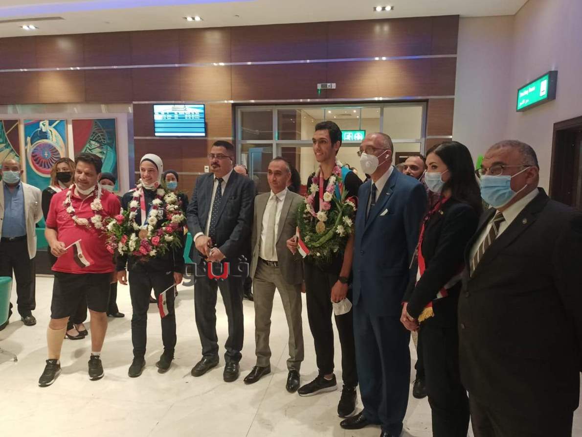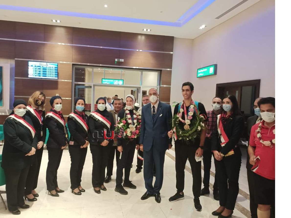 ونظمت شركة ميناء القاهرة الجوي برئاسة المهندس مجدي إسحق، وبحضور الدكتور طارق إسماعيل مدير العلاقات العامة بشركة ميناء القاهرة الجوي، احتفالية واستقبالا خاصا لبطلي مصر هداية ملاك وسيف عيسى، داخل مبنى الركاب رقم 2 بمطار القاهرة بعد وصول رحلتهما.