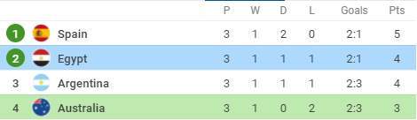 ورفع منتخب مصر رصيده بقيادة مدربه شوقي غريب إلى 4 نقاط متفوقاً بفارق الأهداف عن المنتخب الأرجنتيني الذي تعادل مع إسبانيا بنتيجة 1-1 في نفس التوقيت.