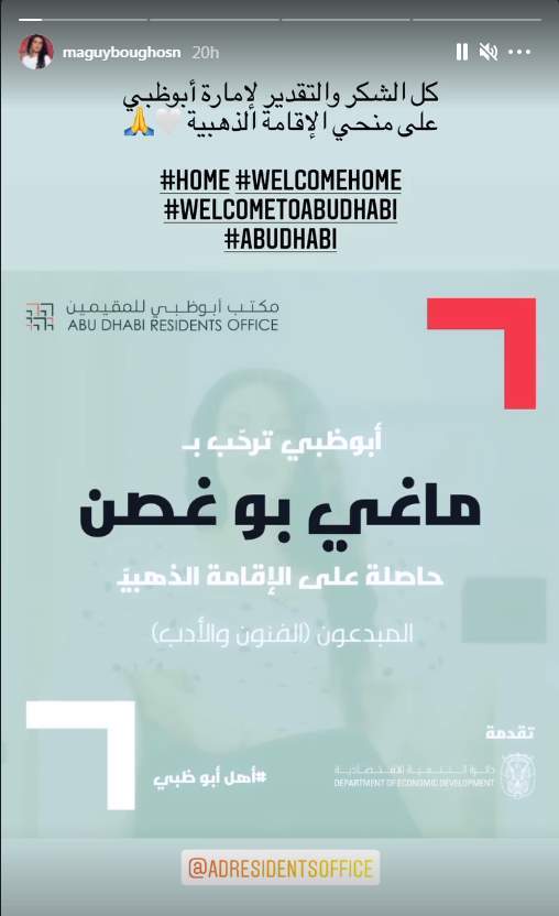 ونشرت ماجي مقطع فيديو لها عبر خاصية "الاستوري" حيث قالت فيه: "أشكر الإمارات العربية على منحي الإقامة الذهبية وهاد الشي بيسعدني ويشرفني، وحصولي على الإقامة بيسهلي زياراتي للإمارات سواء كانت للسياحة أو العمل".