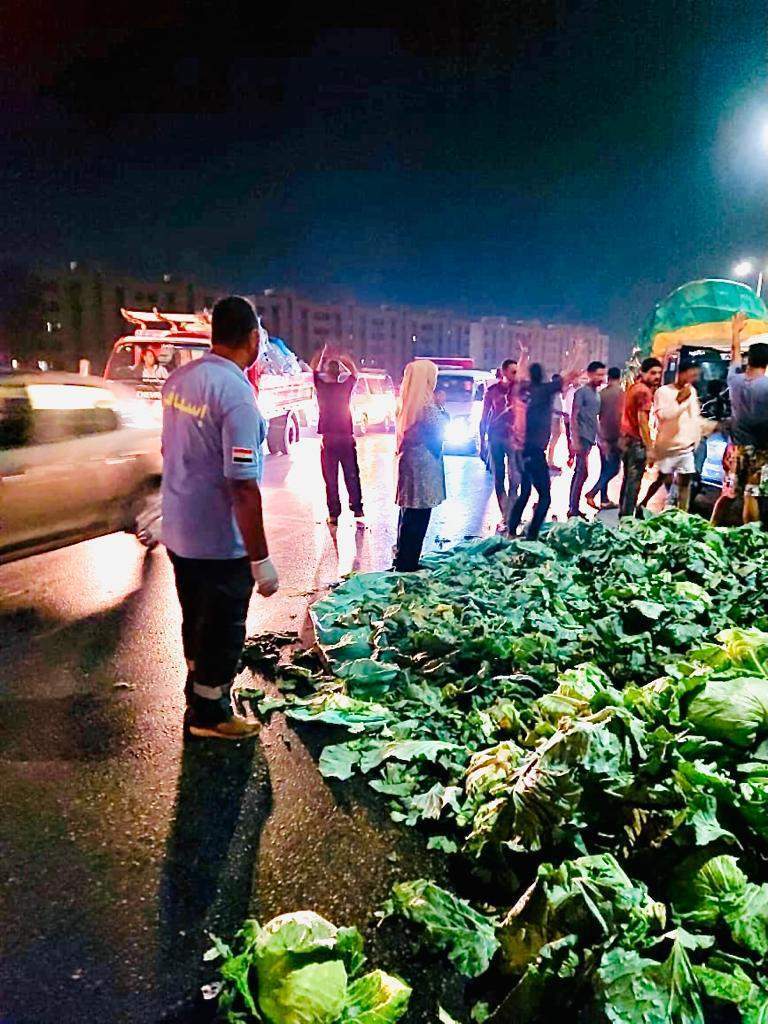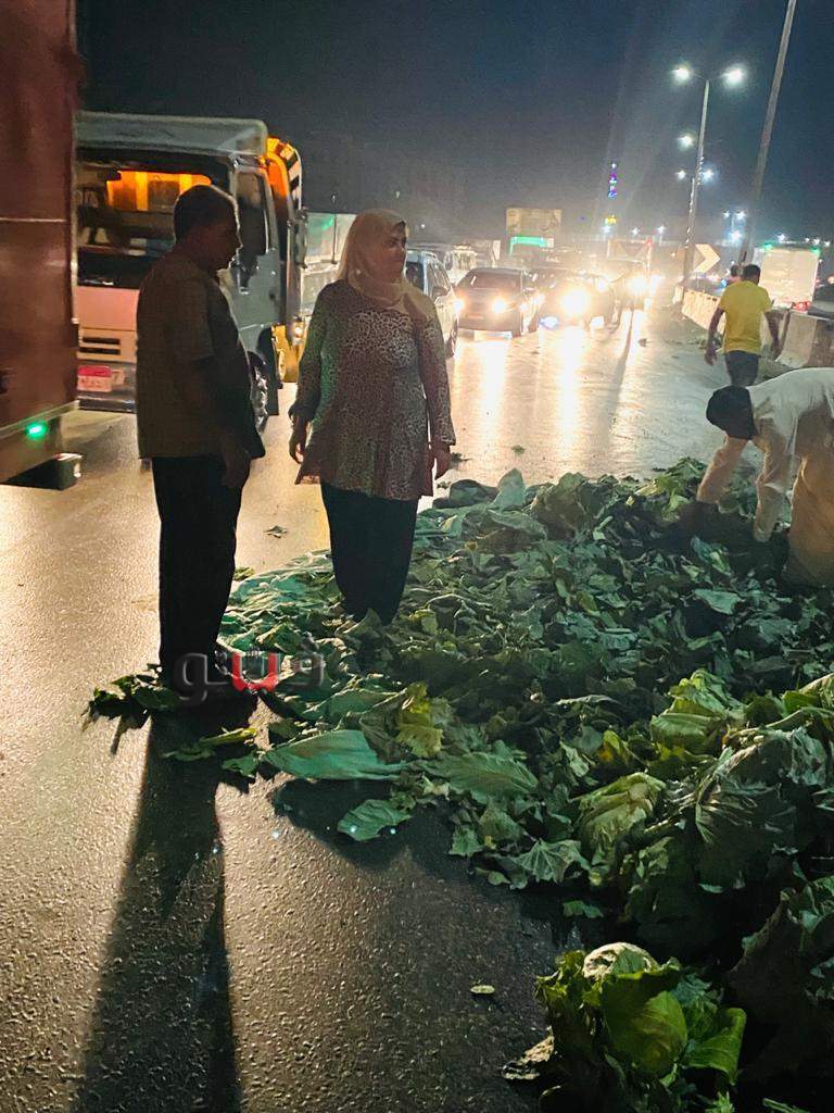 حيث أسفر الحادث عن انقلاب سيارة نص نقل محملة بالخضروات.